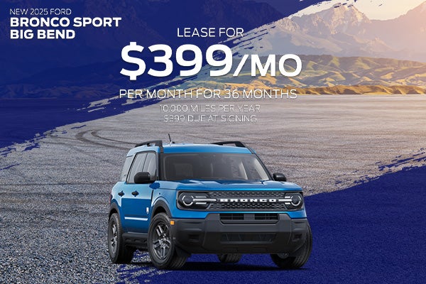 *New 2025 Ford Bronco Sport Big Bend. VIN 3FMCR9BN6SRF42427. Stock #SRF42427. MSRP $33,690. $399 per month lease for 36 months. 10,000 miles per year. $399 cash due at signing. $0 down payment. Security deposit waived. Taxes, title, license, and fees extra. With approved credit through Ford Motor Credit. Not all lessees will qualify. On select models. If provided, Advertised Price EXCLUDES all optional dealer offered items, accessories, or product addendums optionally selected by the purchaser, dealer document processing fee of $797 per TCA 55-17-114, and state and local taxes, tags, registration, and title fees. Advertised prices INCLUDE factory-installed options and non-optional dealer-installed accessories present at time of advertising. See dealer for details. Offer expires 04/30/2026.