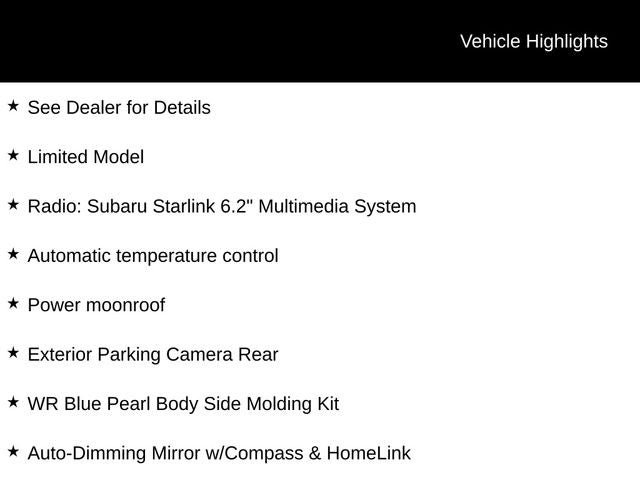 See Dealer for Details, Auto-Dimming Mirror w/Compass & HomeLink, Automatic temperature control, Exterior Parking Camera Rear, Heated front seats, Leather Trimmed Upholstery, Limited Model, Power moonroof, Radio: Subaru Starlink 6.2 Multimedia System, Wheels: 18 x 8.5J Aluminum Alloy/Dark Gray Finish, WR Blue Pearl Body Side Molding Kit.