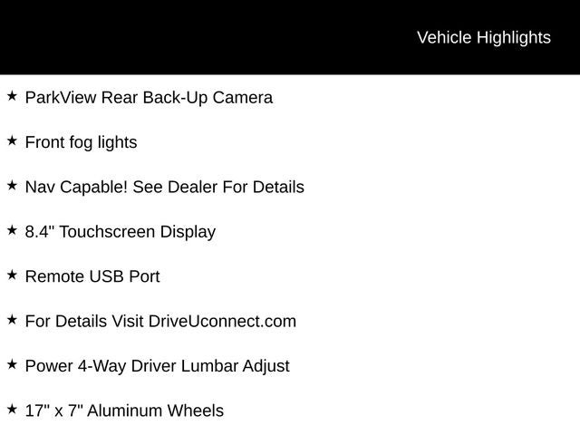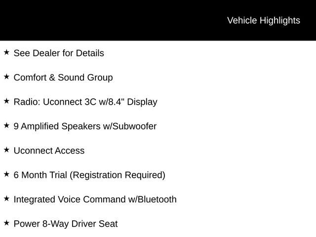 See Dealer for Details, 17 x 7 Aluminum Wheels, 6 Month Trial (Registration Required), 8.4 Touchscreen Display, 9 Amplified Speakers w/Subwoofer, Comfort & Sound Group, For Details Visit DriveUconnect.com, Front fog lights, Integrated Voice Command w/Bluetooth®, Nav Capable! See Dealer For Details, ParkView Rear Back-Up Camera, Power 4-Way Driver Lumbar Adjust, Power 8-Way Driver Seat, Radio: Uconnect 3C w/8.4 Display, Remote USB Port, Uconnect Access.