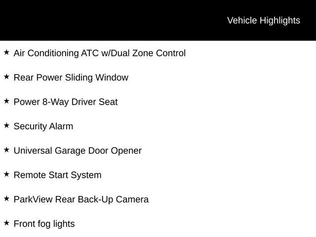 - Rear power sliding window, power-folding mirrors, and remote start for added convenience
