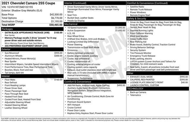 As the proud owner of this 2021 Chevrolet Camaro SS 2SS, you'll enjoy the perfect balance of power, style, and technology. Experience the thrill of the open road and discover the true meaning of driving passion. We invite you to visit our showroom and take this exceptional Camaro for a test drive. Let us help you unlock the full potential of this remarkable sports car.