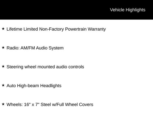 Lifetime Limited Non-Factory Powertrain Warranty, CVT with Xtronic, Auto High-beam Headlights, Radio: AM/FM Audio System, Steering wheel mounted audio controls, Wheels: 16 x 7 Steel w/Full Wheel Covers.