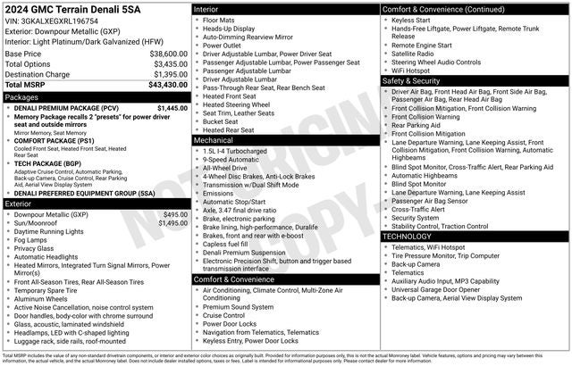 SUNROOF, SKYSCAPE POWER WITH POWER SUNSCREEN, TECH PACKAGE Includes (UV2) HD Surround Vision, (UFQ) Automatic Parking Assist and (KSG) Adaptive Cruise Control.), AUDIO SYSTEM, 8 DIAGONAL GMC INFOTAINMENT SYSTEM WITH NAVIGATION includes multi-touch display, AM/FM/SiriusXM stereo, Bluetooth® streaming audio for music and most phones, Android Auto® and Apple CarPlay® capability for compatible phones, advanced voice recognition, in-vehicle apps, personalized profiles for infotainment and vehicle settings (STD), ENGINE, 1.5L TURBO DOHC 4-CYLINDER, SIDI, VVT (175 hp [131.3 kW] @ 5800 rpm, 203 lb-ft of torque [275.0 N-m] @ 2000 - 4000 rpm) (STD), TRANSMISSION, 9-SPEED AUTOMATIC 9T45, ELECTRONICALLY-CONTROLLED WITH OVERDRIVE (STD), COMFORT PACKAGE includes (KU1) ventilated driver seat, (KU3) ventilated front passenger seat and (KA6) heated rear seats.