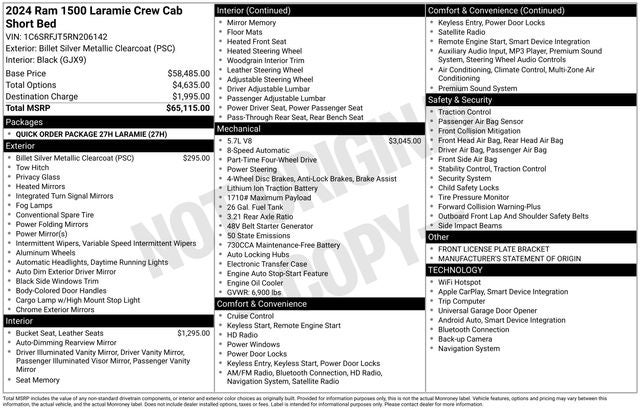 Navigation, 4x4, Heated Driver Seat, Cooled Driver Seat, Back-Up Camera. Ram Laramie with Billet Silver Metallic Clearcoat exterior and Black interior features a 8 Cylinder Engine with 395 HP at 5600 RPM*.